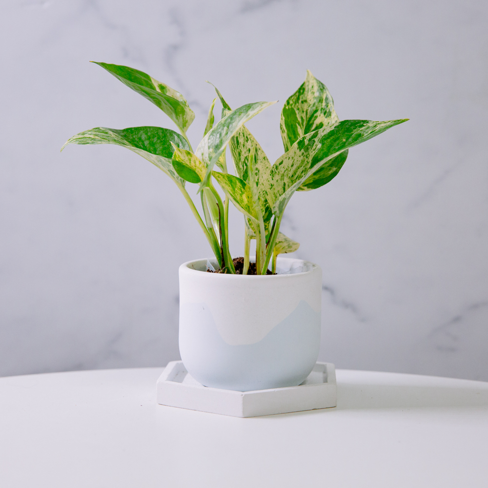 雪花葛, 是黃金葛的親戚哦!所以跟黃金葛一樣非常好照顧,葉片像是雪花與大理石的紋路,隨著環境變化花紋也都不一樣!!越亮的光線雪花會越多、越漂亮,單時儘量不要直曬太陽哦!!