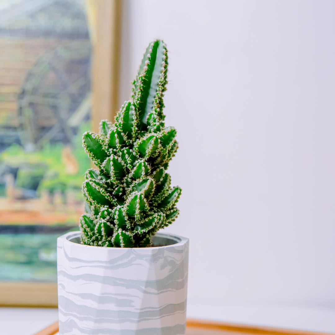 仙女閣為仙人掌科的多肉植物,植株有短刺,外觀呈現叢生多柱狀,就像是一座小小的城堡也像是重重山峰,看起來別具風格。