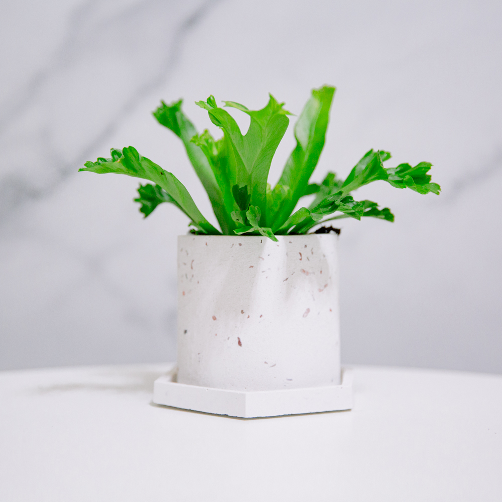 鹿角山蘇為綴化後的一種山蘇,葉片頂端分岔讓他看起來就如同一支支可愛的迷你鹿角,匯聚後更像是一個可愛的小鳥巢。喜歡溫暖潮濕的環境,對光線的要求較不嚴格,但要特別注意,蕨類生性喜歡陰涼且濕度高的環境,在室內的養護要特別注意給予足夠的空間濕度唷!