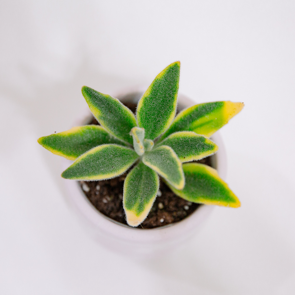 月兔覆輪錦為一般月兔的出藝品種,市面上極為少見的兔耳品種。黃色的錦斑極具特色,生長速度緩慢,可以維持小巧可愛的模樣很長的時間。此款兔耳曾在多肉界掀起一股收藏熱潮,覆輪錦更是非常保值的型態之一呢!在照顧上要特別注意不要露養,並給予充足的陽光,才能讓錦斑維持漂亮的黃色!