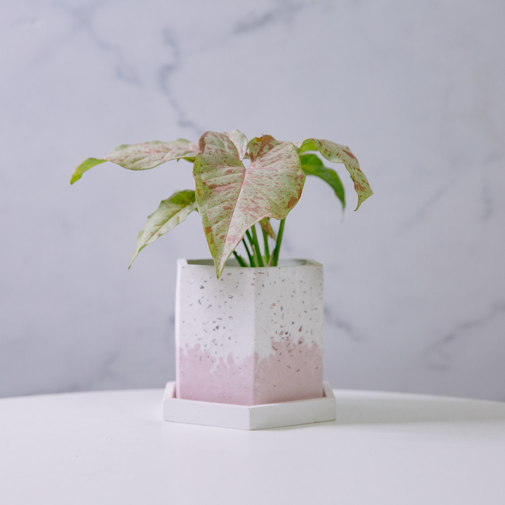 牛奶紙屑合果芋(Syngonium Milk Confetti),剛長出來的葉片是奶黃色,成熟後葉片會變成蘋果綠。蘋果綠配上粉紅色的斑塊,就像在牛奶上灑了紅色的紙屑,每一片葉片都是獨一無二的表現!!屬於長柄合果芋一份子,是許多熱門合果芋的家庭成員喔!!