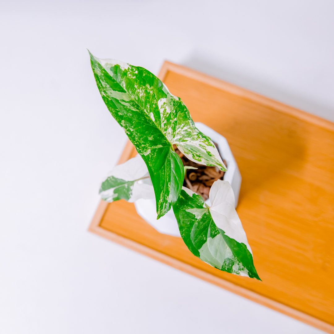 大理石合果芋/白斑合果芋,原產於南美洲的熱帶雨林,是天南星科多年生常綠草本植物。葉片上有雲朵般的白色斑紋,如同大理石般的優雅票料!他也擁有很好的空氣淨化效果,可以吸收空氣中的二氧化碳以甲醛,對光線要求不嚴格的合果芋,只要是通風的散射光處都可以長得很漂亮,無論擺放在哪裡都很適合唷!