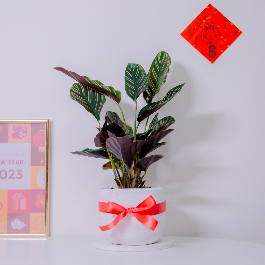 雙線竹芋為竹芋科、肖竹芋屬多年生草本植物。葉片中間有兩條很明顯亮眼的粉白線條,喜歡半陰潮濕的環境,不耐低溫,維持15-30度的溫度對他來說是最適合的生長溫度,適合養在室內通風明亮處。葉片對強光的耐受度不高,所以要盡量避免陽光的直射,以防止葉片焦邊或曬傷!也要常常幫葉片噴水維持一定濕度,才能讓葉片保持最漂亮的狀態唷!