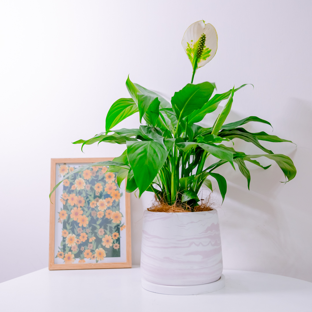 白鶴芋又稱為苞葉芋原產於亞洲及熱帶美洲,為天南星科多年生草本植物。喜歡溫暖潮濕的生長環境,白色的花朵在綠色劍形的葉片中間顯得優雅又亮眼,也能讓人有一種平靜祥和的感覺。白鶴芋耐陰,在室內散射光的位置也能開花,並且有強大的空氣淨化能力,很適合放在辦公室、居家空間中!