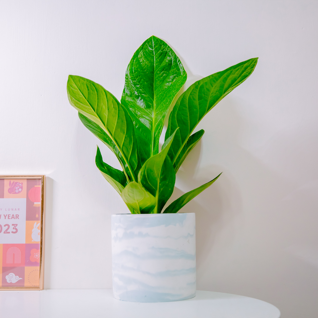 富貴花燭原產於南美洲,為多年生草本植物。葉片寬圓厚實,大氣的模樣讓他得到很好的寓意,也象徵著富貴!很適合放在辦公室、居家空間綠化不治,耐陰又耐旱,非常好照顧,喬遷、開幕的極佳選擇之一!